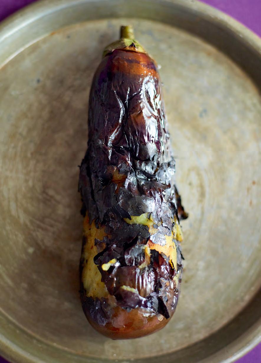 Dříve jsem lilky pro tento recept pekla v troubě, ale poté, co jsem viděla svou tetu z Porbandaru, jak ty své dokonale opekla nad plamenem sporáku, už jsem to nemohla dělat jinak. Držela lilek za zelený stonek nad sporákem, dokud jeho slupka nezuhelnatěla a nezačala vykukovat měkká krémově bílá dužina. Pak zčernalou slupku sloupla a lilek uvařila v česnekovo-rajčatové omáčce.