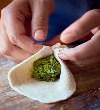 Kačori připravíte tak, že doprostřed vyválené placky vložíte vrchovatou lžičku hráškové směsi a okraje těsta kolem ní pevně zabalte, aby vzniknul malý měšec. Ten pečlivě utěsněte a odeberte případné přebytečné těsto. Pak ukoulejte kačori do kuličky a položte na plech. Poté stejně připravte i zbytek těsta. První kačori možná budou vypadat trochu zvláštně, ale aspoň budete vědět, které po upečení využít k ochutnávání.