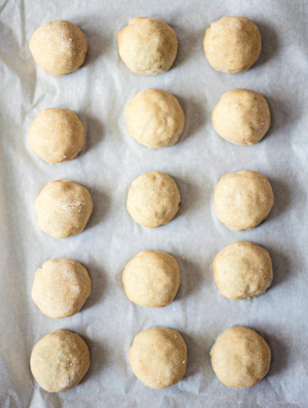 Před rozválením těsta si připravte pracovní plochu. Budete potřebovat čistou pomoučenou desku, misku s moukou a váleček na těsto. Z těsta si odeberte malý kousek, přibližně o velikosti marshmallow. Vložte kuličku těsta do misky s moukou, aby se obalila, a pak ji vyválejte na placku o průměru zhruba 10 cm (velikosti dna hrnku). Abyste si práci urychlili, můžete před válením a plněním rozdělit všechno těsto na malé kuličky.