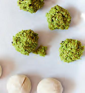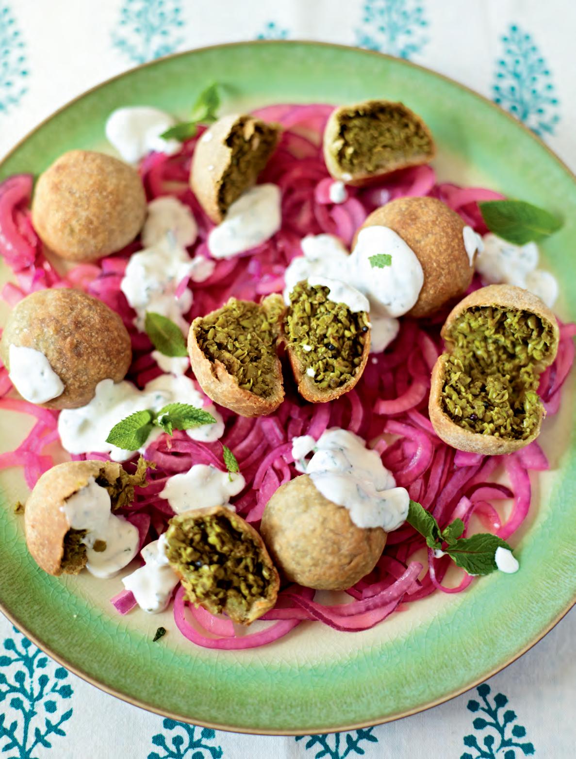 Tohle lahodné kulaté zelené potěšení je starou gudžarátskou pochoutkou. Často se kačori podávají na rodinných oslavách, protože je velice snadné je nenápadně slupnout, když se nikdo nedívá. Kuličky pečené v troubě jsou nejlepší podávané na lůžku z cibule nakládané v limetkové šťávě (viz strana 221) a doplněné mátovo-jogurtovým čatní (viz strana 219).