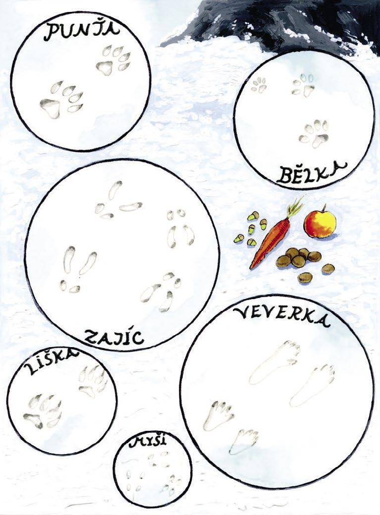 Našli jsme i stopy veverky. Neuvěřitelně skákala! Zajímavé je, že přední tlapky veverky mají čtyři prsty (a jsou menší) a zadní mají pět prstů.