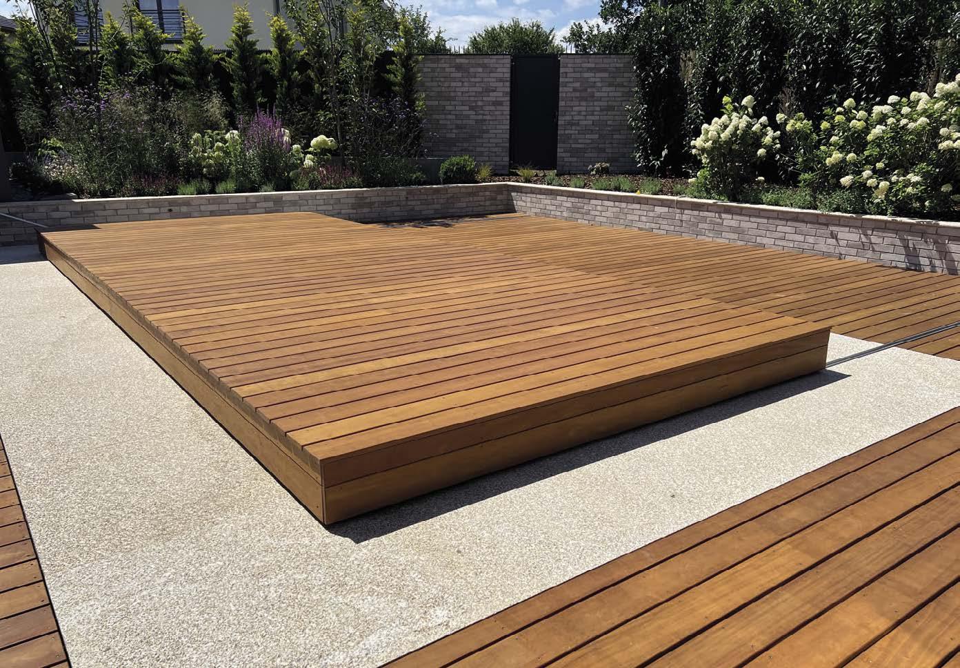 Umoderního domu vypadá dřevěná terasa vkombinaci skamenem vždy dobře. Pod vyvýšenou dřevěnou terasou je zde přitom ukryt bazén – stačí terasu jen posunout, aona tak vytvoří „molo" vedle bazénu.