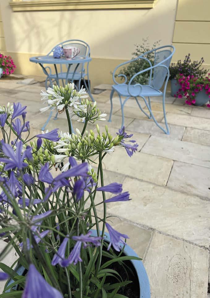 Když na staré zahradě něco najdete, zkuste to nejprve využít – vtomto případě opět poslouží natřený starý zahradní nábytek i původní květináče.