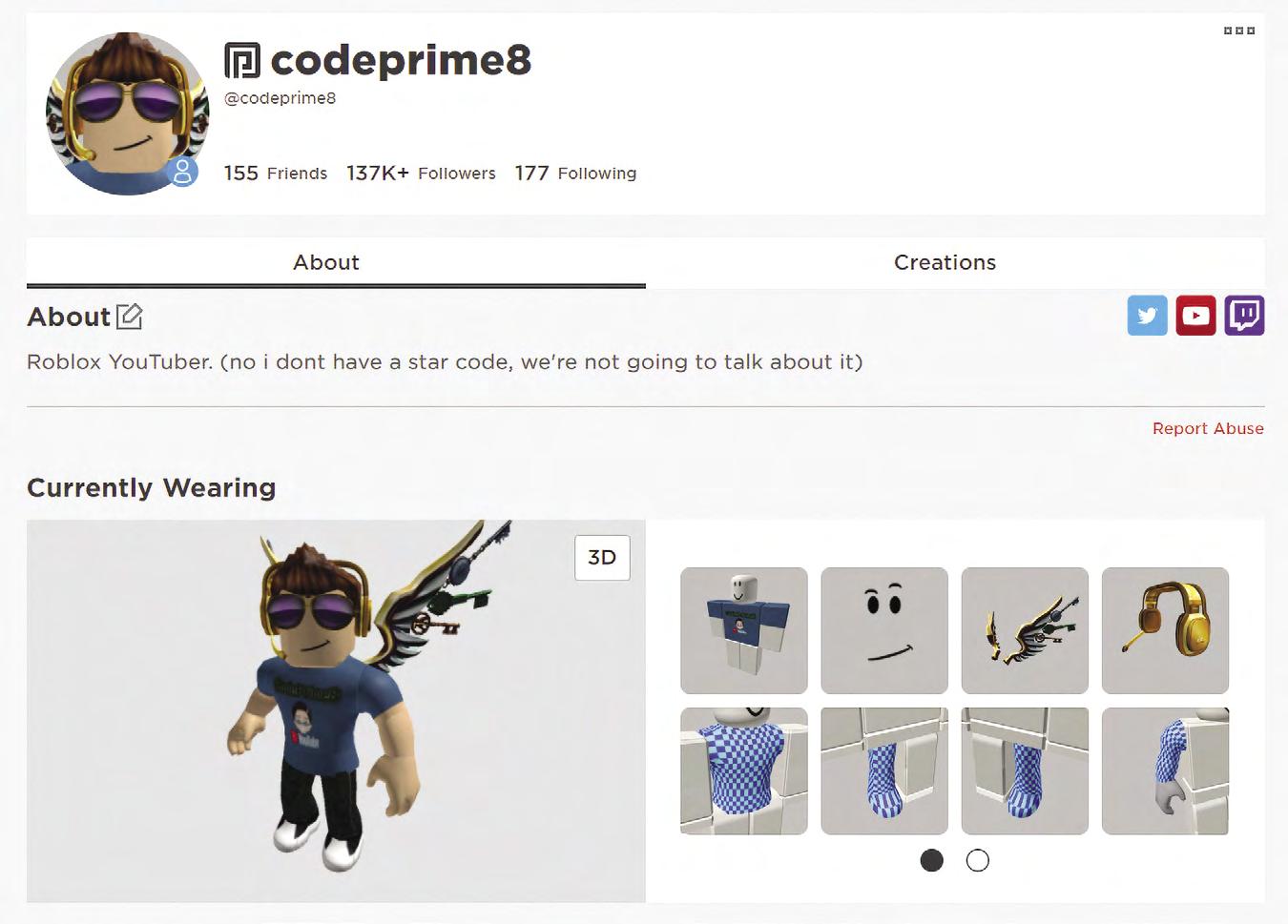 Na této stránce se zobrazuje, kolik přátel, sledujících a lidí na Robloxu sledujete Zobrazí se zde také váš online stav V části About (O mně) se zobrazují osobní údaje, které jste mohli zadat na stránce My Settings (Moje nastavení) při první registraci Pod tím můžete vidět, jak vypadá váš robloxový avatar, a to buď ve 2D (jako na papíře), nebo ve 3D (jako herní figurka) Mezi oběma verzemi můžete přepínat klepnutím na tlačítka 2D