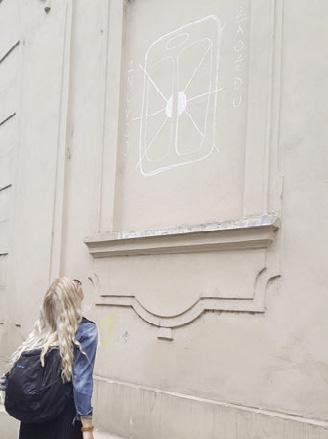 Vrátíme se ke kostelu a obejdeme ho směrem k ulici Anežské. Dobře se dívejte na zeď.