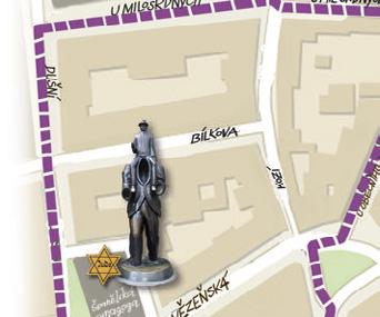 Nalevo vidíte významnou židovskou památku – Španělskou synagogu s muzeem. Židovské muzeum v Praze patří k nejstarším evropským židovským muzeím. Základem jeho sbírek jsou předměty ze synagog a modliteben, jež zanikly v důsledku asanace pražského židovského ghe a. Vidíte patník s obličejem?