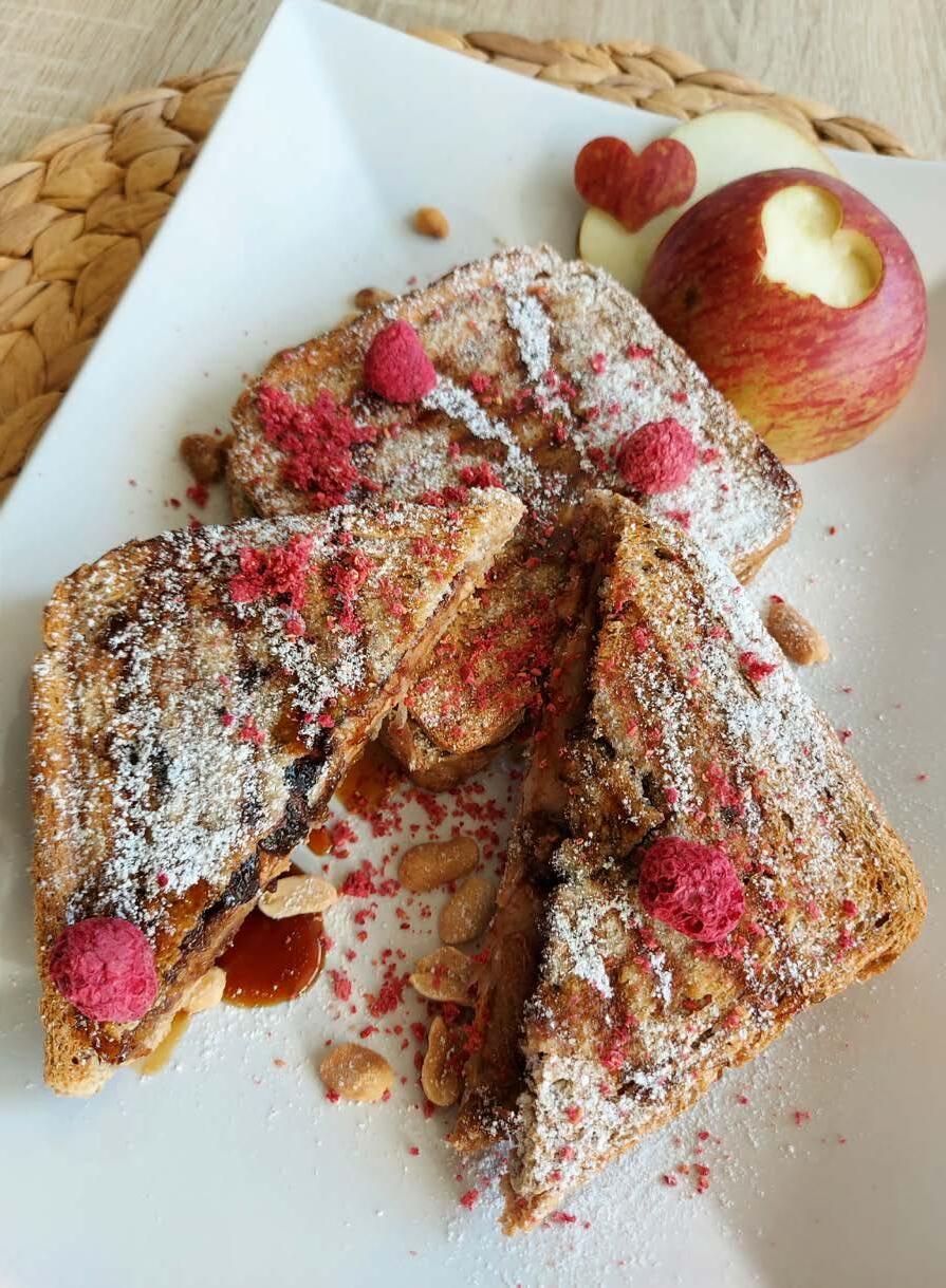 Na 1 toast natřete arašídové máslo. Protože většina arašídových másel je neslazená, můžete tuto vrstvu posypat trochou cukru, ale není to nutné. Poté nahrubo nastrouhejte nebo na tenké plátky nakrájejte ¼ jablka a vše posypejte rozinkami a skořicí. Na plátek, kterým toast zavřeme, natřete čokoládovo-oříškovou pomazánku. Její skvělou variantu v rostlinné verzi seženete například v DM drogerii.