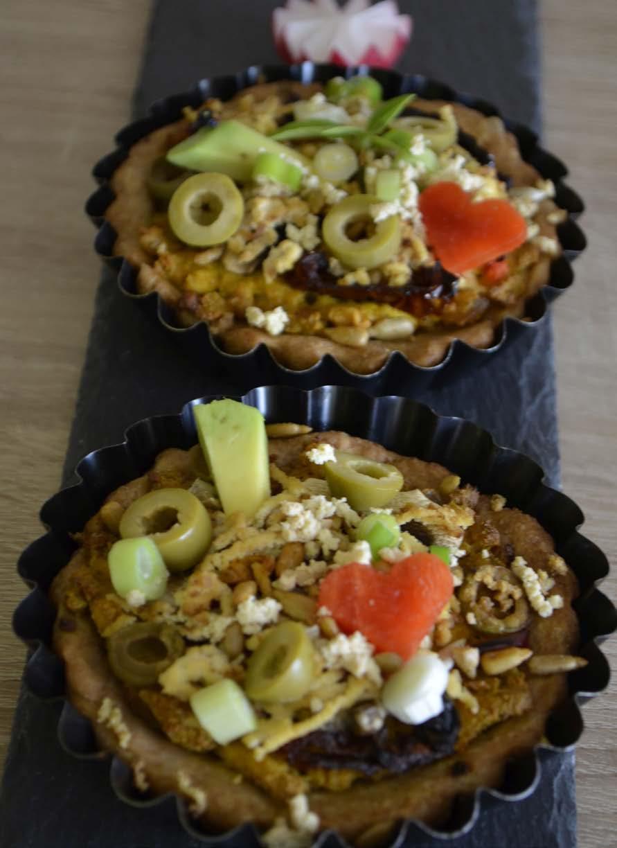 Na závěr můžete ještě dozdobit čerstvou zeleninou a olivami. Těsto vystačí na formu velkou cca 30 cm nebo na šest menších koláčků.