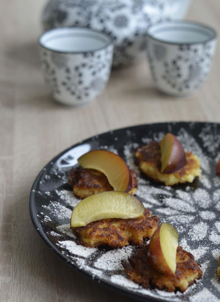 Na rozpáleném oleji smažte malé hromádky, které dávejte na pánev pomocí lžičky. Doporučuji smažit na kokosovém oleji, který má tu výhodu, že se nepřepaluje – resp. přepaluje, ale při mnohem vyšších teplotách než běžné oleje. Po usmažení dejte placičky na papírovou utěrku, která odsaje přebytečný tuk. Protože do těsta nebyl přidán žádný cukr, je dobré hromádky přelít třeba datlovým sirupem nebo pocukrovat. Nakonec je můžete ještě dozdobit čerstvým ovocem.