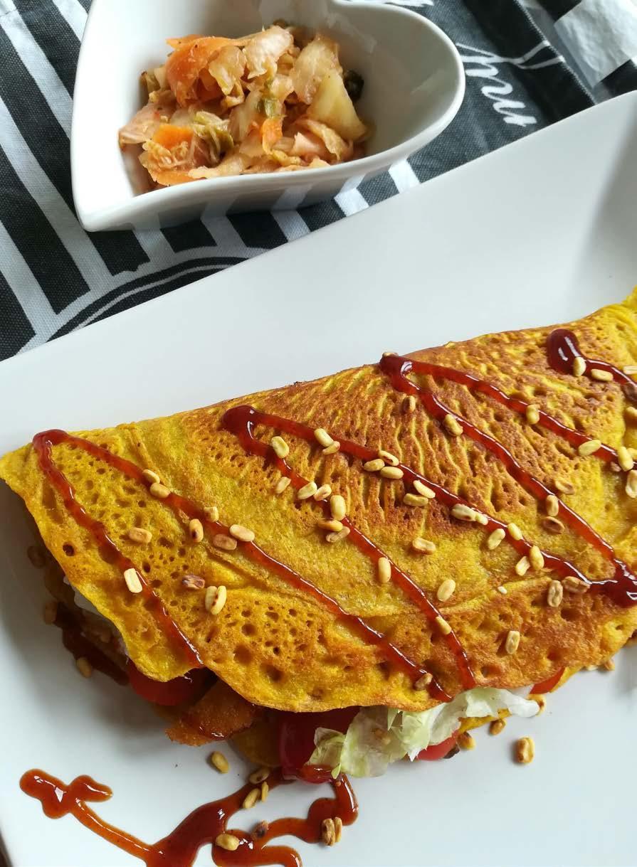 Skvělá varianta klasické omelety. Díky tomu, že se dělá z luštěniny, je nabitá bílkovinami, spoustou vitamínů a neobsahuje žádný cholesterol. Luštěninou jsou zde fazole mungo. Možná je znáte jako celé malé zelené fazolky, které se nakličují. Stejné fazolky ale lze koupit i loupané a půlené. V takové podobě jsou krásně žluté. A přesně ty budeme na naši omeletu potřebovat.