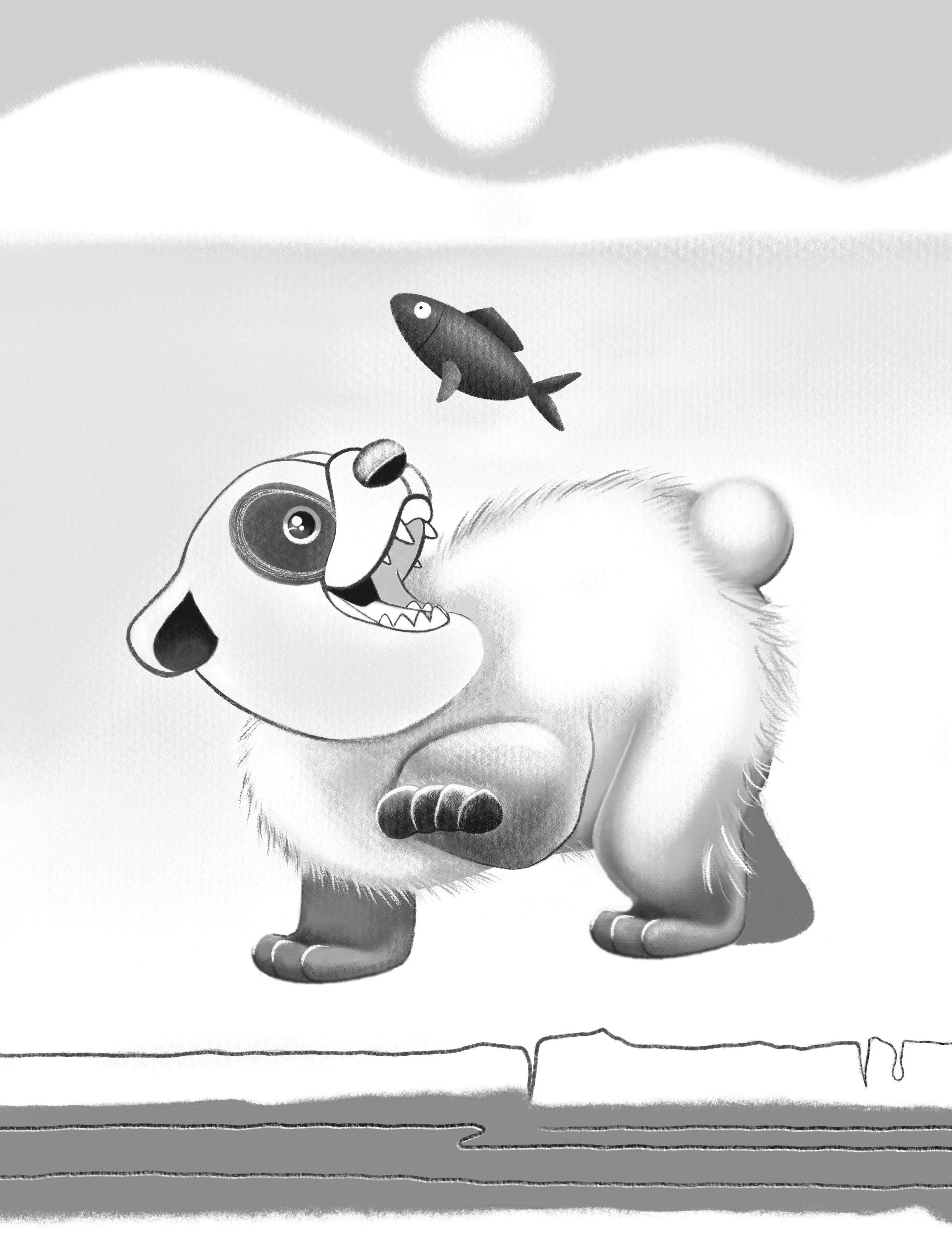 „Ale, ale, tady někomu kručí v bříšku. Neboj, něco s tím uděláme. Ukážu ti, jak si my medvědi sháníme potravu.“ Když medvídě uvidělo, že Honzík si nápadem na lov není moc jistý, mávlo na něj tlapou a dalo se do běhu. Zastavili se až u velké díry v ledu. „Tak tady si ulovíme něco k večeři, máš rád ryby?“ Honzík přikývl, i když představa syrové ryby k obědu ho trošku děsila. „Neboj se, uvidíš, že ti to bude chutnat.“ „A to jíte jenom ryby?“ ptal se Honzík zvědavě.
