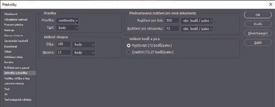 1 Úpravy/Edit > Předvolby/Preferences > Jednotky a pravítka/Units & Rulers (Windows), případně Photoshop > Předvolby/Preferences > Jednotky a pravítka/Units & Rulers (Mac).