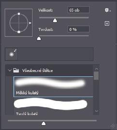 6 Klepnutím na šipku vedle složky Všeobecné štětce/General Brushes si ji rozbalte, vyberte první typ štětce (Měkký kulatý/Soft Round) a změňte jeho velikost na 65 pixelů.