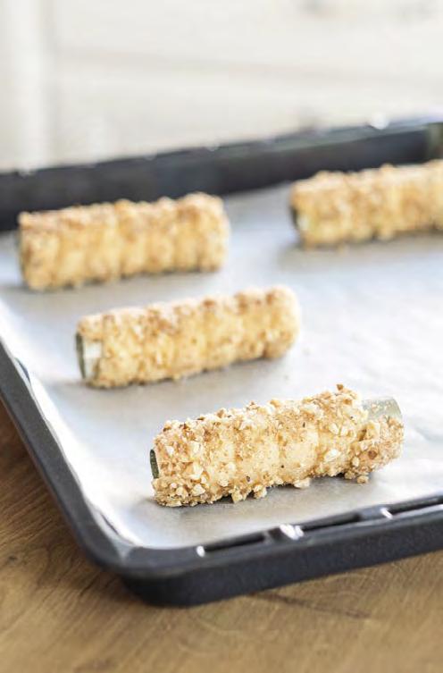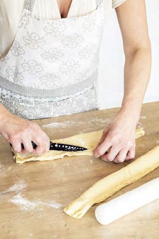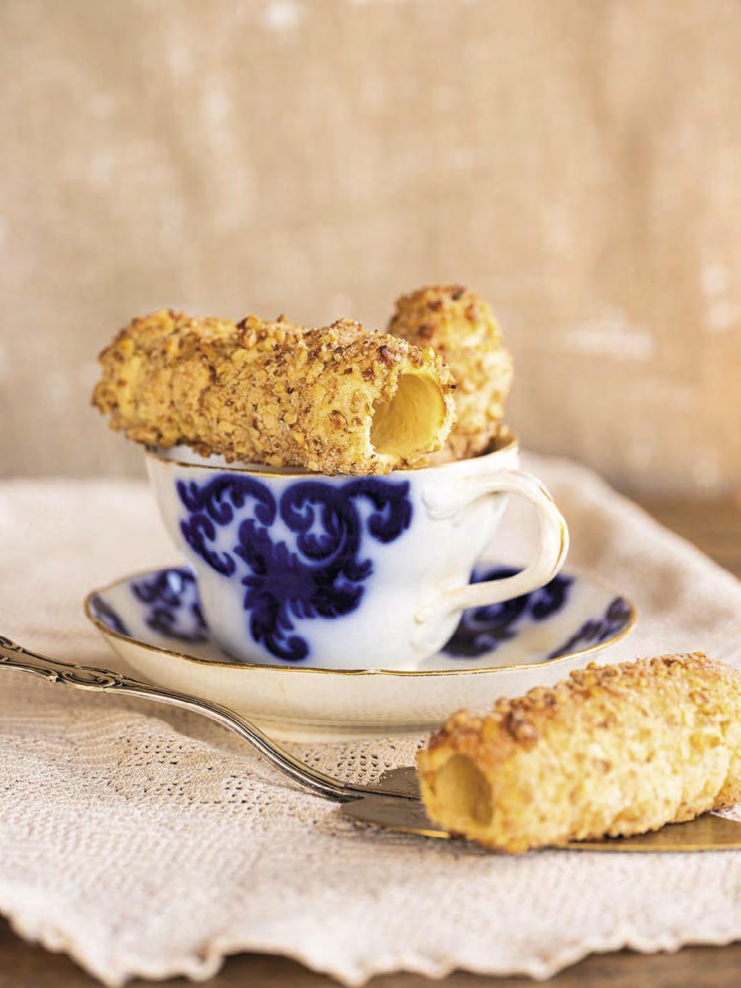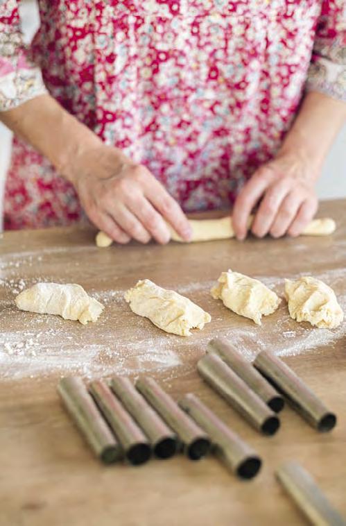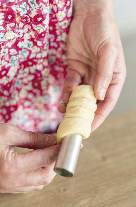 �o vykynutí vyválíme na pomoučeném povrchu 1,5 až 2 cm silné vá� lečky. �řipravíme si dřevěný váleček (můžeme použít i �ormičky na kremrole). �řevěný váleček obalíme v alobalu (lze použít i pečicí papír) a na něj nebo na �ormičky, které předem omastíme, navíjíme válečky těsta. Těsto by se mělo obtočit cca třikrát až čtyřikrát, záleží na tom, jak velké chcete trdelníky mít. �ehce oběma rukama navinuté těsto přitlačíme, potřeme rozšlehaným bílkem, obalíme v ořeších a cukru se skořicí a dáme péct do předehřáté trouby na 230°C, horní a spodní ohřev. Trdelníky jsou upečené během 10minut, tak je hlídejte. �eště horké je sundáme z válečků nebo �ormiček, pocukrujeme krupicovým cukrem a můžeme jíst.