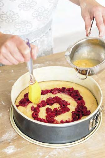 Vykynuté těsto zlehka propracujeme a rozválíme ho válečkem na obdélník cca 55 � 25 cm. Těsto by mělo být asi 0,5 cm tlusté. �bdélník podélně rozkrojíme napůl, do středu každého dílu dáme tvarohovou náplň, kraje přitiskneme k sobě, aby náplň nevytekla. �o vymazané dortové �ormy stočíme kolem okrajů první díl, na který napojíme druhý a stočíme je do spirály. �o mezer mezi díly nasypeme ovoce, které do těstalehce přitiskneme, potřeme rozšlehaným vejcem a můžeme posypat mandlemi. Ve �ormě nechámeještě cca 20 minut kynout. �ředehřejeme troubu na 155 °C, horní a spodní ohřev, pečeme cca 40 minut. �o vychladnutí můžeme koláč pocukrovat moučkovým cukrem nebo potřít máslovým krémem.