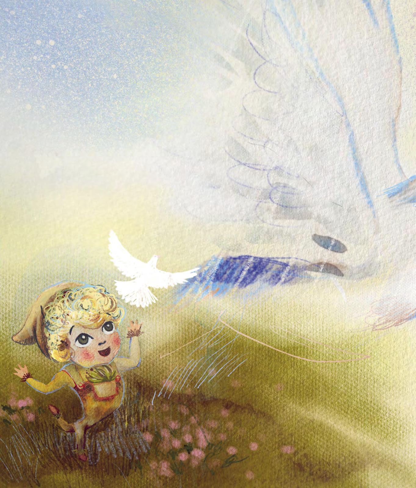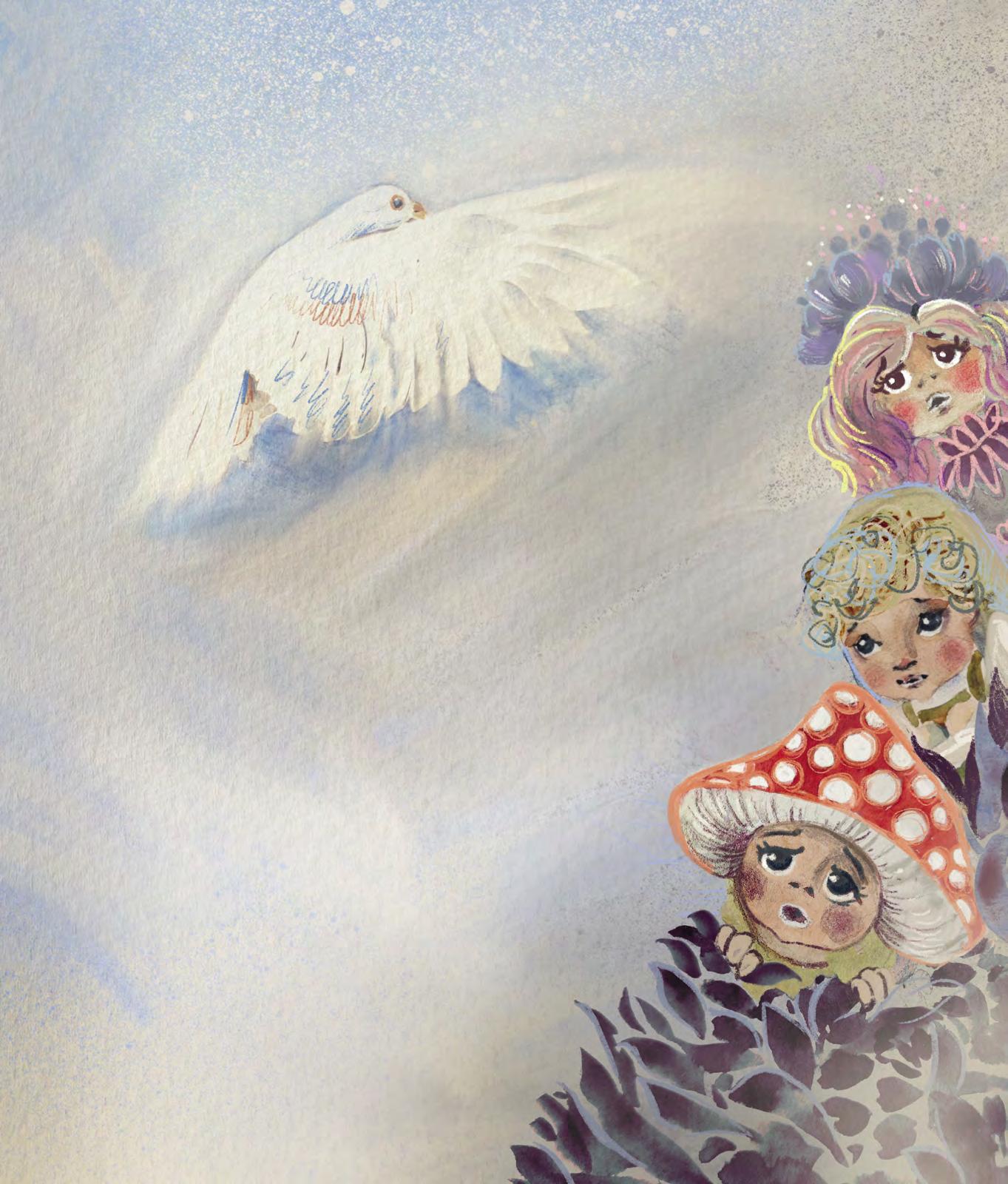 a z úst mu vyletěla sněhově bílá holubice. Letěla pak dlouho, až dorazila do světa lidí. Tam shlížela na ten lidský rej a vybírala si toho pravého člověka.