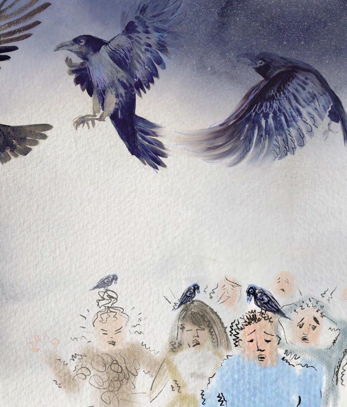 Samo sebou, že kdykoliv vypustil nějakou štiplavou větu, z jeho úst zároveň vylétl havran a vrhal se na holubičky. Zakrátko nebyla jediná holubička, která by dokázala doletět až do světa lidí.