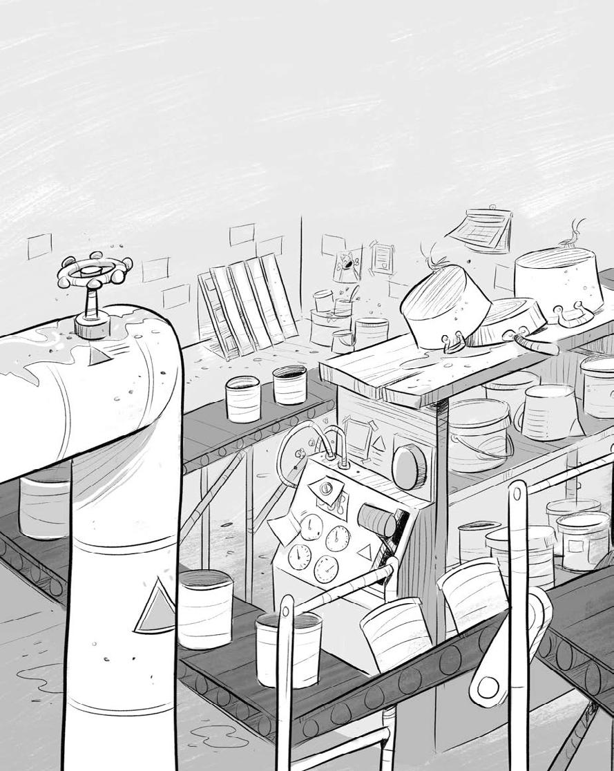 Na bežiacom páse po miestnosti kolovali konzervy a z veľkého bublajúceho hrnca uprostred sa valil NECHUTNÝ ZÁPACH!