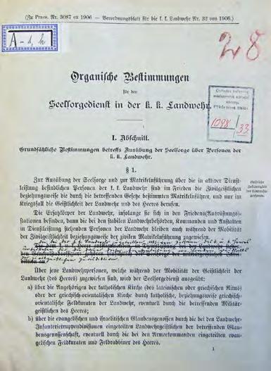 Služební kniha A1h. Organická ustanovení o vojenské duchovní správě rovněž spadají do období rakousko uherské monarchie a ve velmi dobrém stavu se dochovala ve sbírkách Vojenského historického archivu do dnešních dnů. Takových dokumentů, které dokládají historii duchovní správy před I. světovou válkou, se v českých archivech nedochovalo příliš mnoho, zejména v takto zachovalém stavu. Zajímavostí je, že tento předpis byl používán po vzniku ČSR i v československé armádě, a to až do doby vydání nového předpisu