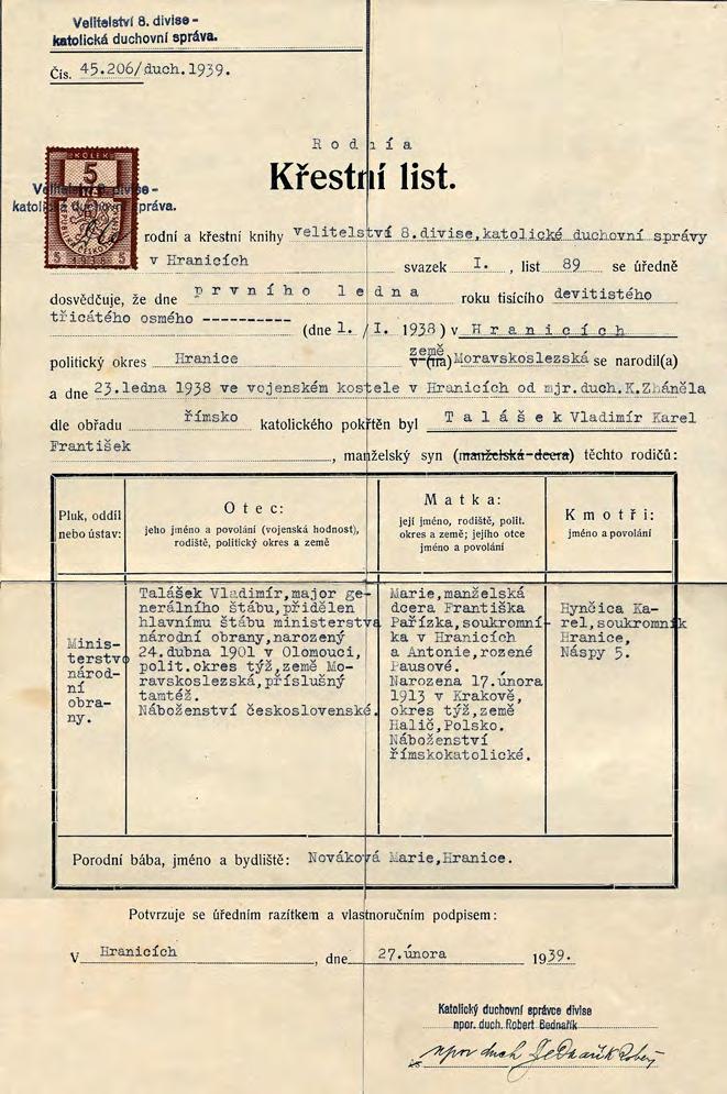 Rodný a křestní list Vladimíra Taláška, vystavený katolickou duchovní správou u velitelství 8. divize v Hranicích na Moravě, podepsaný divizním duchovním správcem nadporučíkem duchovním Robertem Bednaříkem