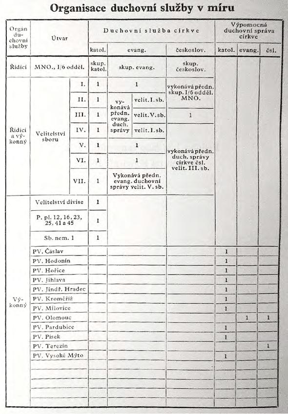 Přehledná organizace duchovní služby včetně výpomocné duchovní správy, jak vypadala na konci třicátých let minulého století v československé armádě. Z tohoto přehledu je patrná organizační struktura od úrovně Ministerstva národní obrany až posádkových velitelství. Současně je též zřejmé poměrné zastoupení jednotlivých církví ve struktuře samotné armády
