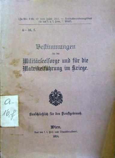Služební kniha A16f. Ustanovení o vojenské duchovní správě a o vedení matrik za války dnes již neexistující rakouskouherské armády. Tehdy ještě nebyl znám pojem I. světová válka, ale válečné události, které se spustily po sarajevském atentátu, vstoupily do povědomí jako Velká válka, která trvala 1 564 dní. Bohužel, po ní pak přišla ještě strašlivější II. světová válka, jež se protáhla na 2 194 dnů utrpení. Služební kniha byla používána duchovními i v době 1. republiky do doby, kdy ji nahradil služební předpis AXI1 z roku 1938