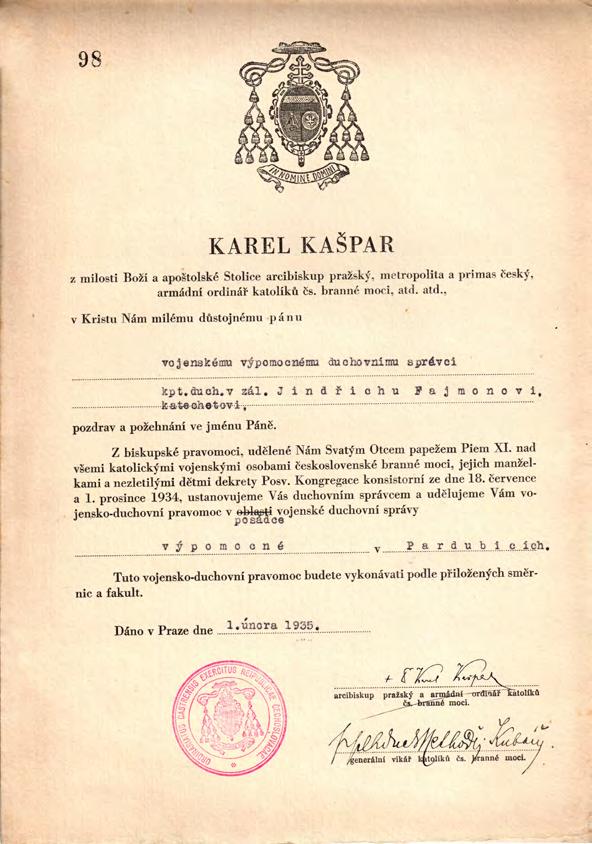 Ustanovení vojenského výpomocného duchovního pro vojenskou posádku v Pardubicích Ustanovení vojenského výpomocného duchovního správce pátera Jindřicha Fajmana, kapitána duchovního v záloze, katechety v Pardubicích. Dekret podepsali armádní ordinář Karel kardinál Kašpar a katolický generální vikář čs. branné moci podplukovník duchovní služby Methoděj Kubáň