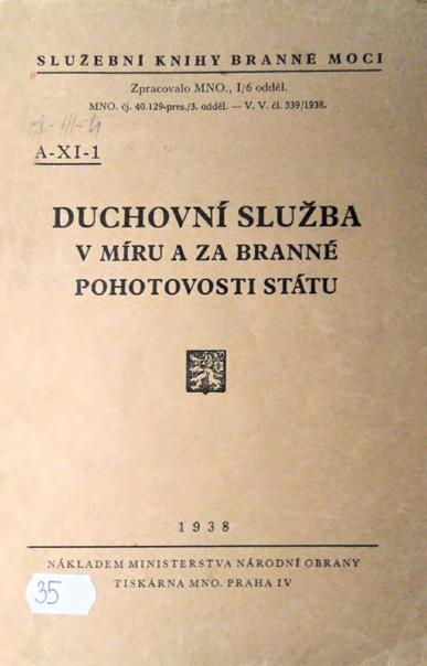 Nevyhnutelnost válečného konfliktu se neřešila jen u útvarů zbraní československé armády, ale i útvarů služeb, pod které spadala i duchovní služba. Služební kniha AXI1 Duchovní služba v míru a za branné pohotovosti státu vydaná v roce 1938 toho byla důkazem, že armáda musí být připravena na vše, tedy i na otázku řešení duchovní služby v době války
