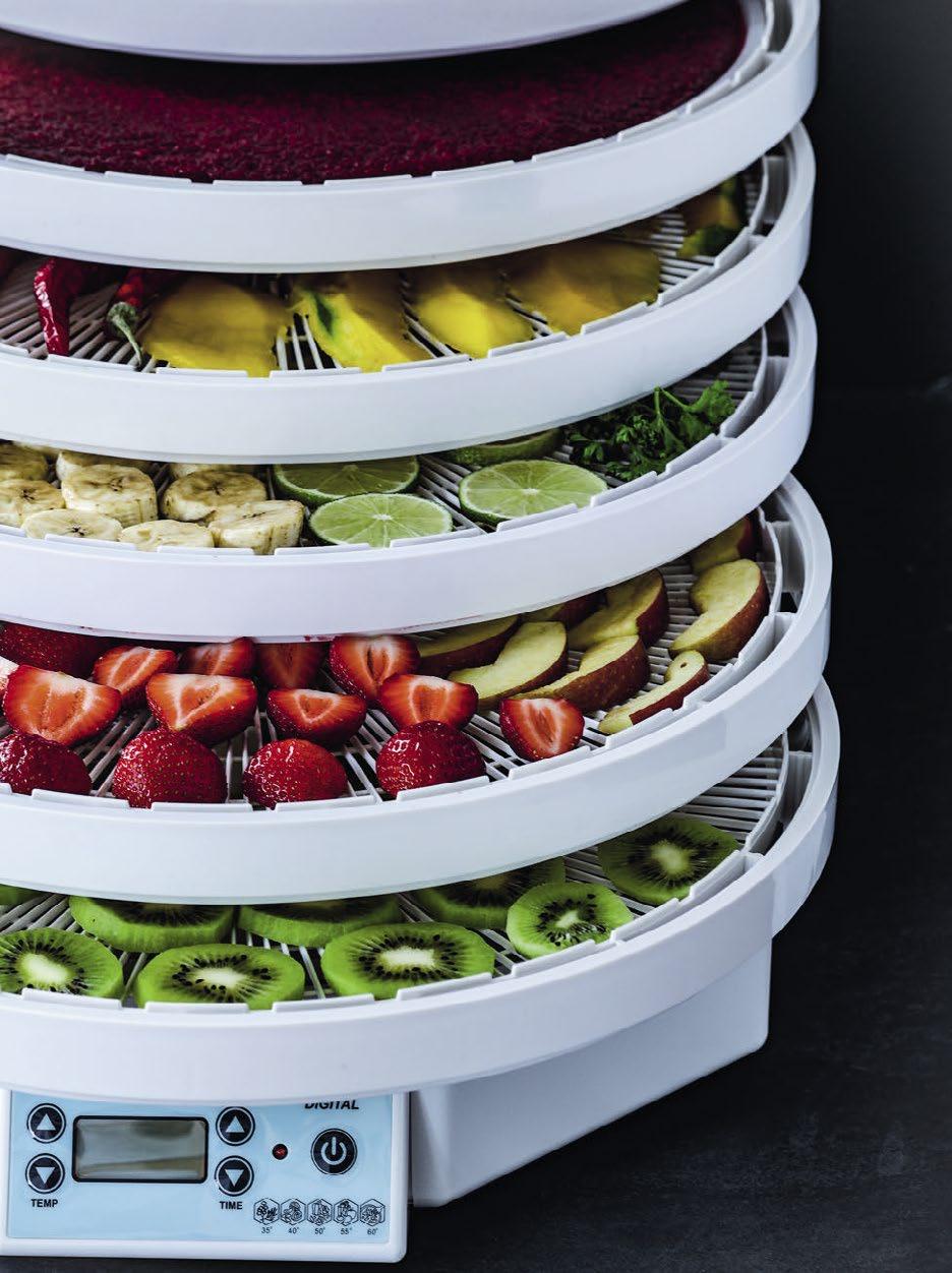 • Časovač: Základní sušička potravin se pouze zapíná a vypíná. Časovač může být nepostradatelný, pokud chcete sušit přes noc nebo když jste přes den v práci. Díky časovači se přístroj po zadané době sám vypne. Dobu sušení můžete nastavit od jedné hodiny po 48 hodin. Po uplynutí nastaveného času pak některé sušičky přepnou na udržování teploty 30 °C, aby potravina nenatáhla vlhkost zpátky.