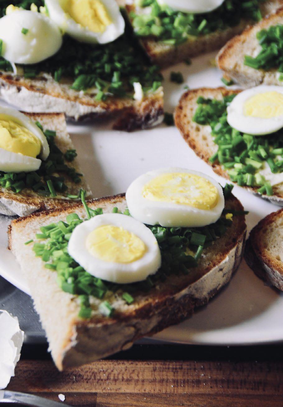 Pokud bych měla vybrat jeden jediný recept jako signifikantní… tak je to chleba s máslem, pažitkou a vejcem. Recept je velmi jednoduchý, skoro nejde pokazit, ale stojí na elementárních kvalitních ingrediencích a bude vás stát trochu té námahy. Chléb si upečte domácí kváskový, máslo pořiďte od krav pasoucích se venku a pažitku čerstvou ze záhonu. A dobrou sůl. No a vejce? Vejce jedině od šťastných (ideálně vašich) slepic. A pak už jen vejce uvaříte na hniličku, chléb nakrájíte, každý namažete vrstvou másla, posypete hojně pažitkou a pokladete plátky ještě lehce teplého vejce, které posolíte hrubou mořskou solí. Máslo pod vejci začne pomalu roztávat a vsakovat se do měkkého a nadýchaného chleba…