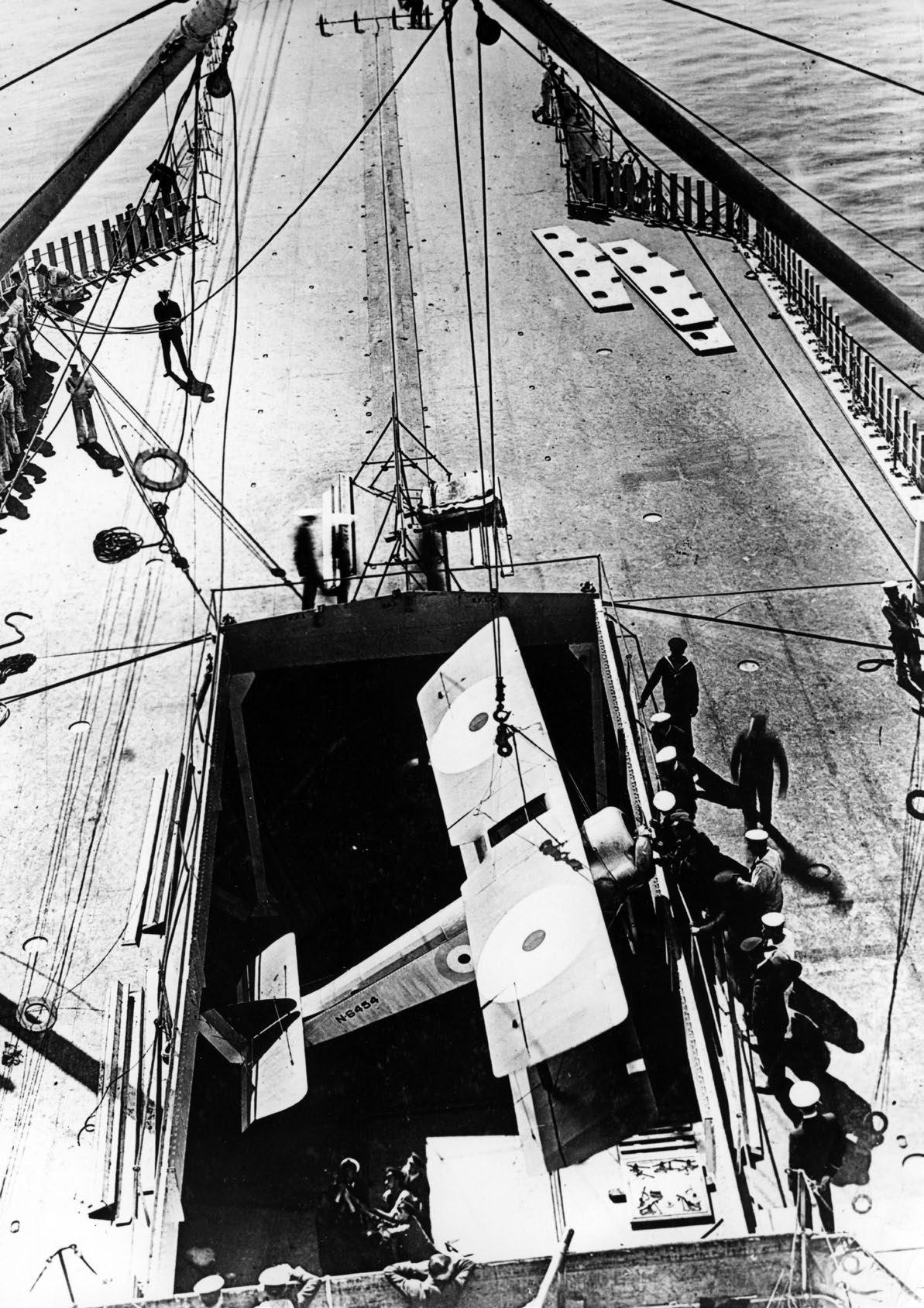 Stíhací letoun Sopwith Pup (zaveden roku 1916) je v roce 1918 zvedán jeřábem na letovou palubu HMS Furious