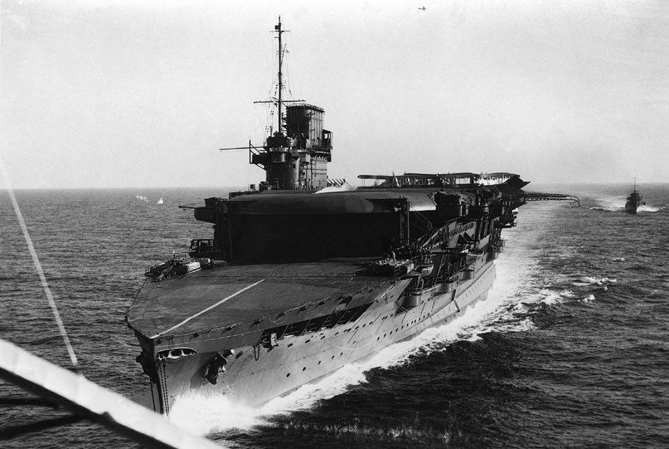HMS Courageous ukazuje svoji sníženou letovou palubu na přídi. Za povšimnutí stojí jeřáby na obou bocích. V roce 1931 se stala první britskou letadlovou lodí s příčnými záchytnými lany, jež učinila přistávání bezpečnější.