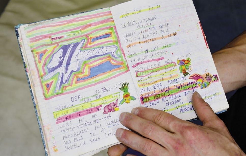 Když jsem trénoval na umělé stěně, zapsal jsem si třeba jenom: „Byl jsem tam a tam…“, ale už jsem si nepoznamenal, co jsem vylezl. Tenkrát se má mánie se zapisováním do lezeckého deníčku rozrostla do absurdních rozměrů. Vytvořil jsem si dokonce systém: zapisoval jsem si, kterou cestu jsem považoval za hodnotnou nebo nehodnotnou. Pak jsem vše označil zvýrazňovači, přičemž určitá barva s rámečkem značila nejhodnotnější cesty, k nimž jsem připisoval citoslovce „juchů“ nebo „jabadabadů“. Jabadabadů mělo vyšší hodnotu. Ještě jsem si k rámečkům lepil i nálepky. Čím víc nálepek, tím lepší! Nálepky zvířátek, později třeba nálepky postaviček z Asterixe nebo Garfielda. Přelezy s obrázkem Obelixe měly největší hodnotu, neboť to byl můj favorit.