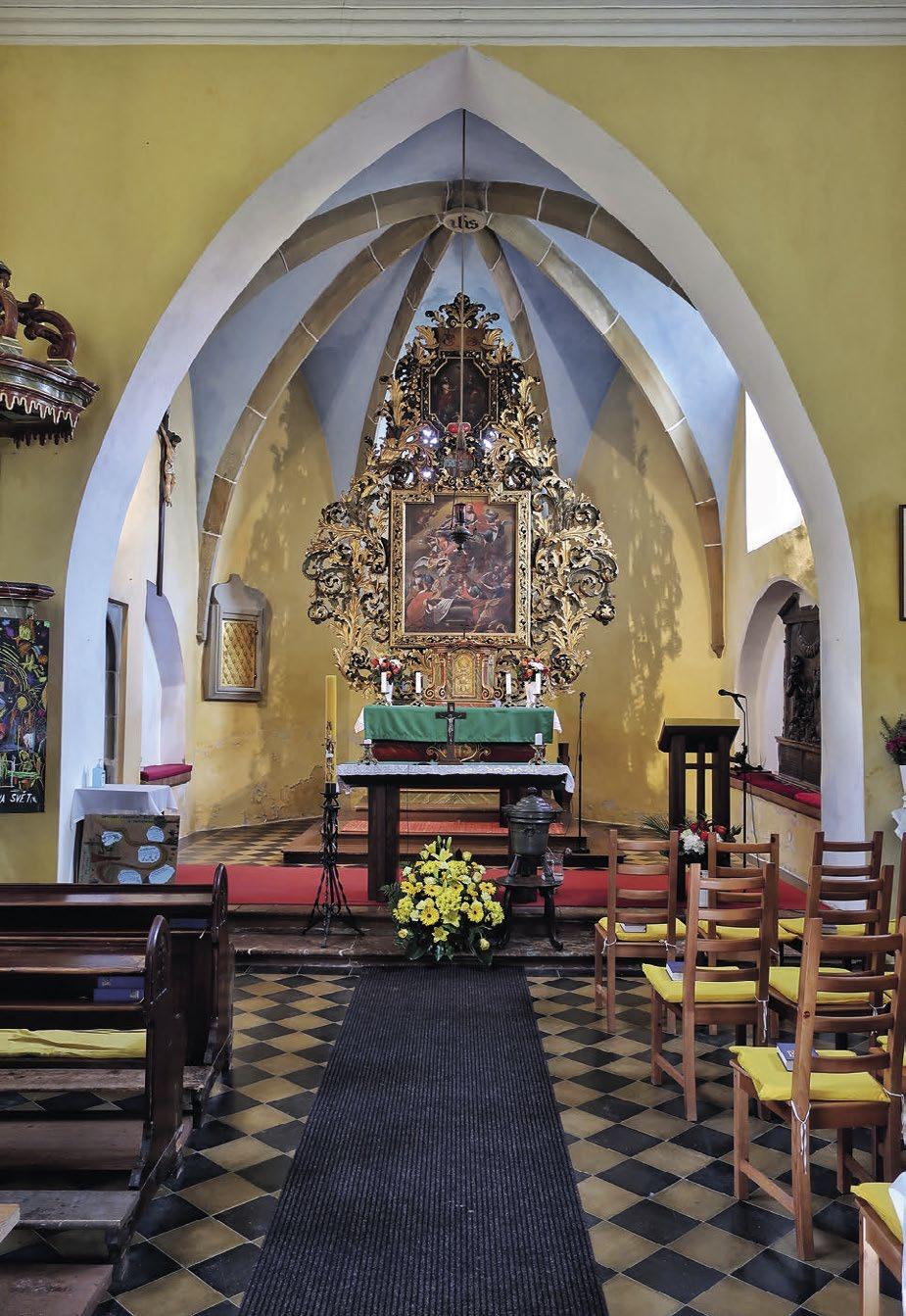 v polovině devatenáctého století. Poprvé si je mohu prohlédnout díky Noci kostelů. Vstupuji dovnitř raně barokní předsíní a gotickým portálem, pak už se ponořím do středověku, gotické malby mne obklopují doslova ze všech stran. K dalším vzácnostem patří gotická kamenná křtitelnice a pozdně gotický hlavní oltář, na pravé straně je oltář renesanční, kazatelna pochází z raně barokního období. Dřevěnou
