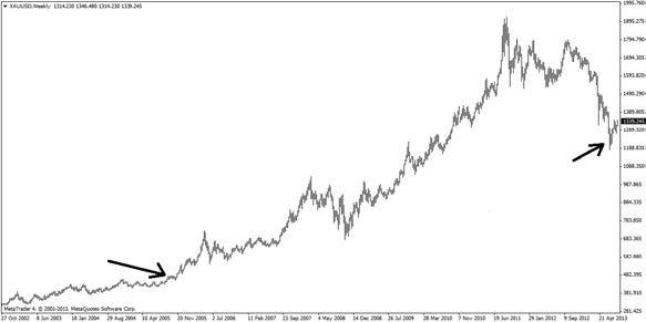 Obrázek 1.1 Investování (buy and hold); na grafu je ukázka investování do zlata (XAU/USD, Gold)