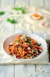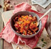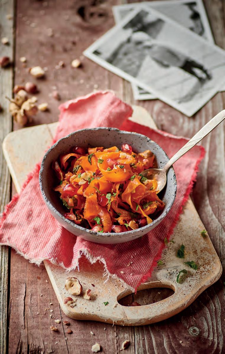Mrkev poté přemístěte do servírovacích misek, přidejte zrníčka granátového jablka, mátu a lískové ořechy rozdrcené v hmoždíři.