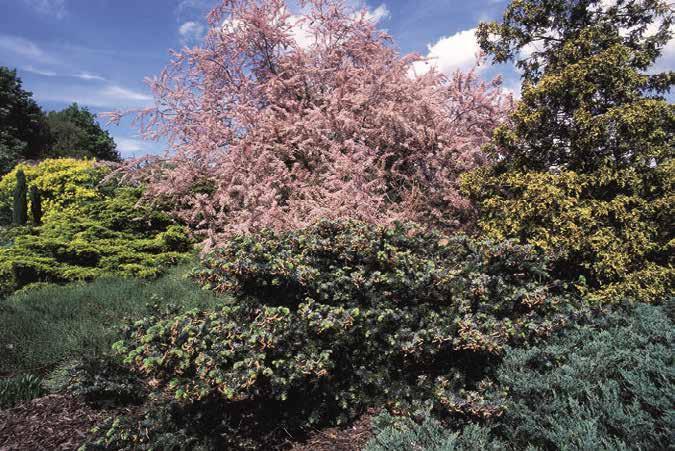Abies amabilis ’Spreading Star’ – v pozadí tamaryšek (R. Rybková)