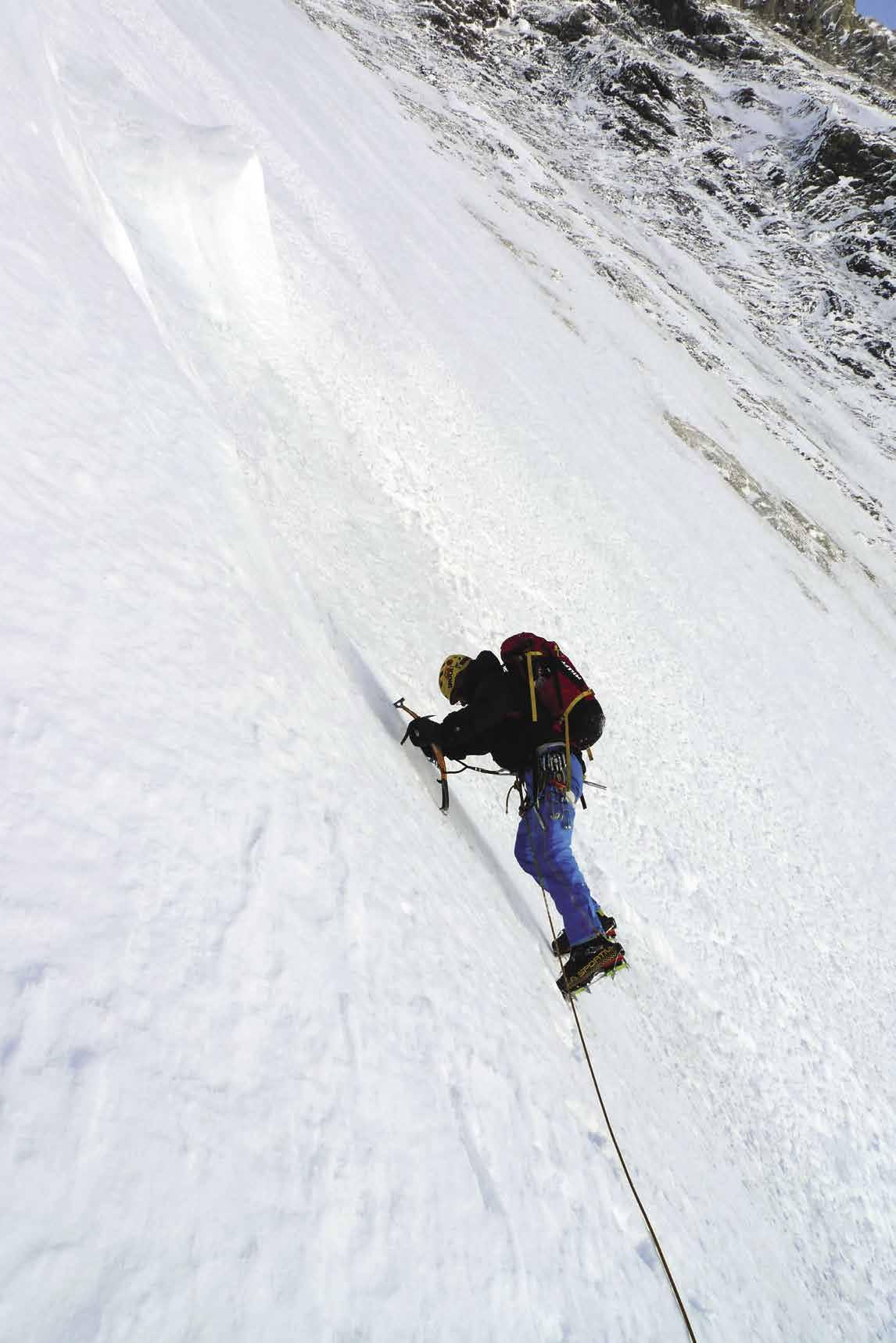 Navázal jsem na jejich myšlenku a poprvé začal pronásledovat tuto jihozápadní stěnu v roce 2009. K nástupu jsem si vybral levý ledový kuloár v centrální stěně. Sice skýtal