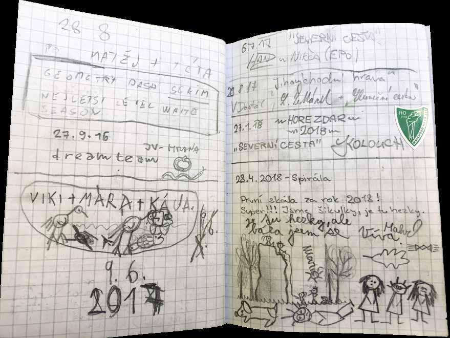 Vrcholová knížka a v ní zápis vlevo dole, třetí lezecká generace