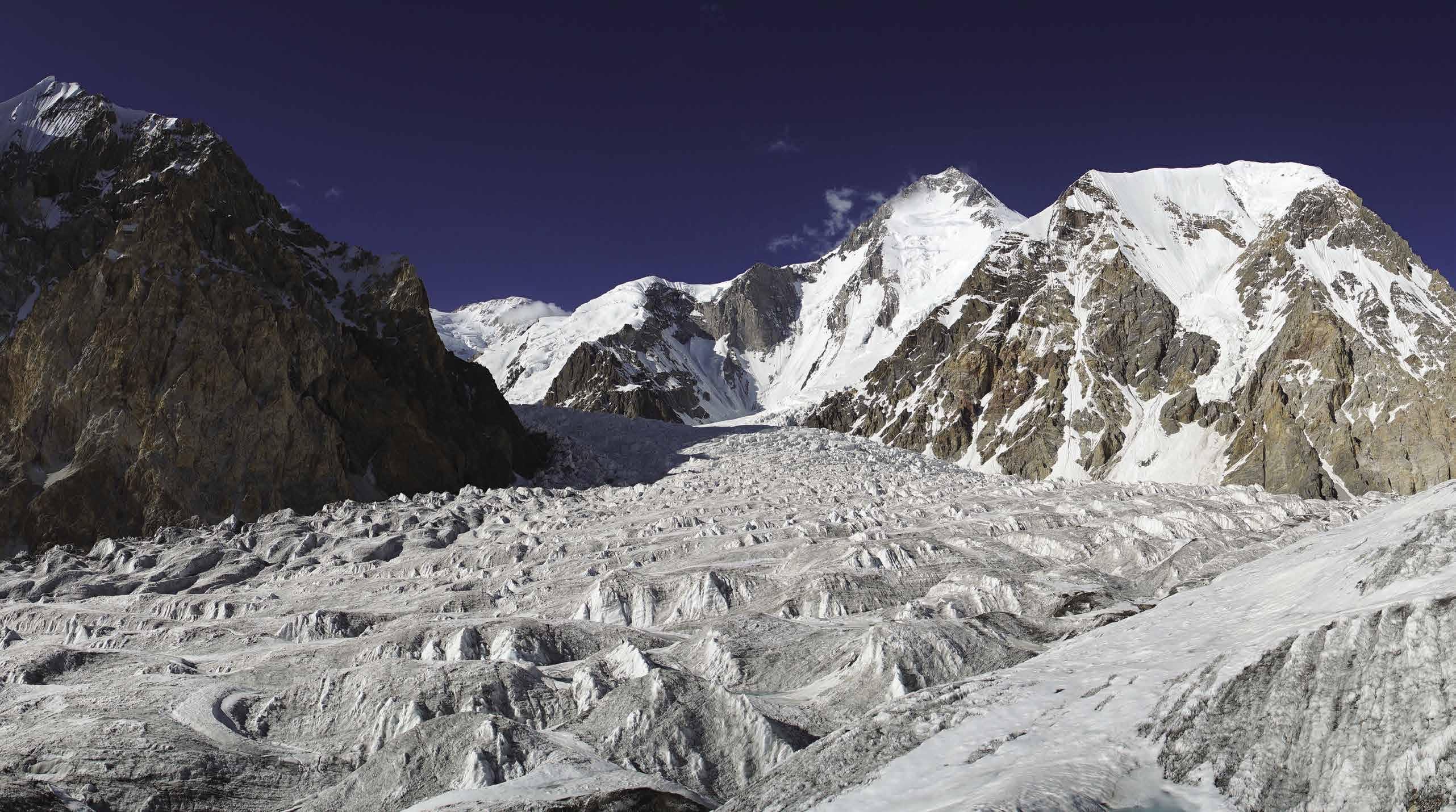 nebezpečí pádu séraků a lavin v případě sněžení, ale také nejrychlejší nástup do hlavní stěny. Jedinou nezodpovězenou otázkou zůstával nejasný přelez z kuloáru do sedla přes skalní sifon v 7 400 metrech, ústící na sněhové plato pod vrcholovou hlavou. Tento první klíč stěny jsme ale společně s parťákem Zdeňkem Hrubým po druhém bivaku a přelezením nepříjemných mixů nakonec vyřešili. Následující den ráno jsme pokračovali dál, až do 7 500 metrů pod skalní bariéru. Z těchto míst jsme se však bohužel museli za více než dramatických podmínek vracet…