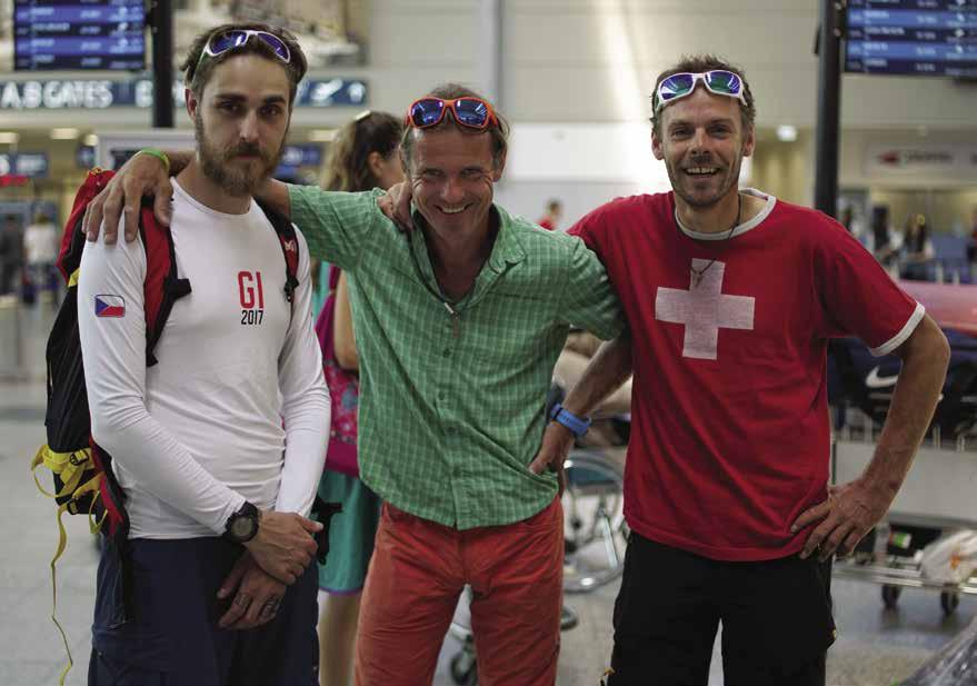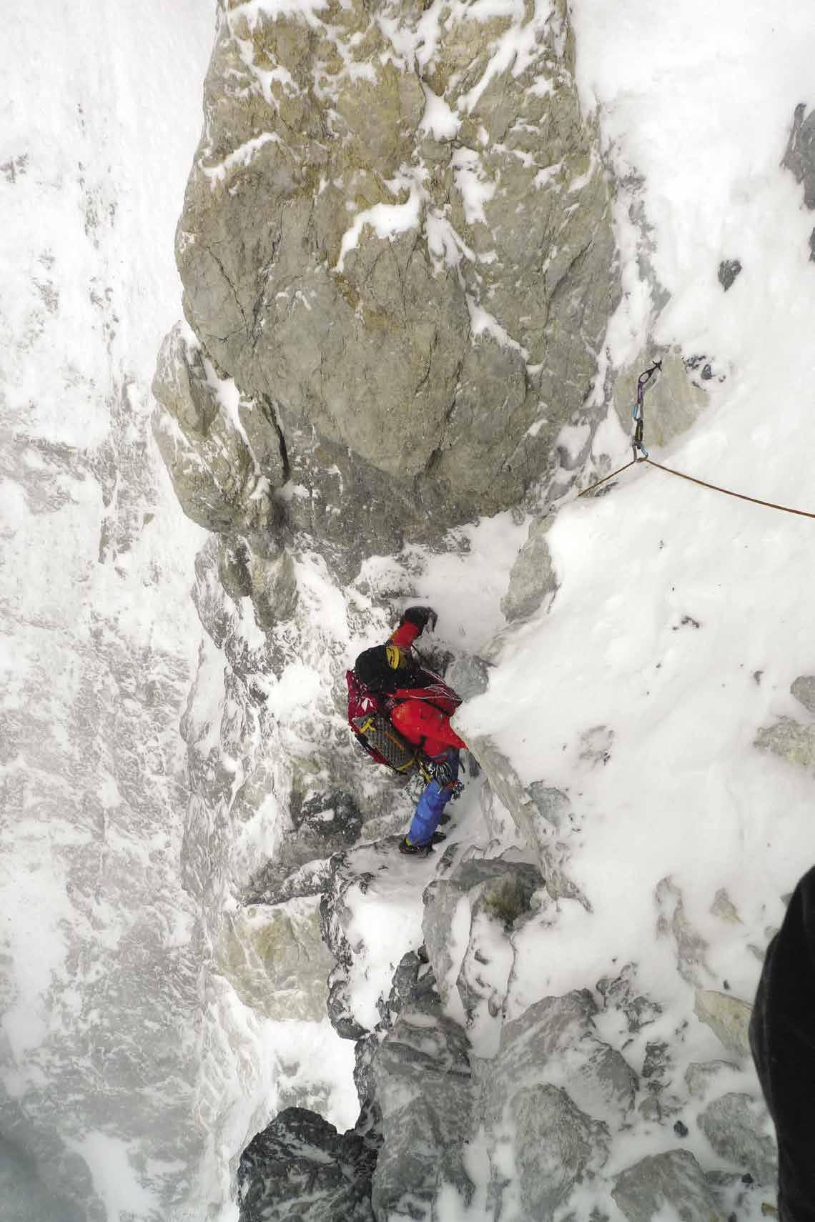 zda se do ní půjde schovat, nebo ne. Ale důvod ke spěchu byl jasný. Kuloár je sběrnicepadajícíhosněhuužjenpřisilnějšímvětru,natožpřisněžení.Noa jakmilesekolemdesátépřetočísluncedostěny,stáváseokamžitěstřelnicípadajícíchšutrů.Noční lezení nabízí placebo – nevidět tu hrůzu nad sebou – a mráz ještě drží kameny na svémmístě.Přestojepotřebabýtirychlýa účelný.K závěrudalšíhodnesedostáváme po těžkém mixovém lezení na sedélko, které je spojeno s platem a vrcholovou skalní hlavou. Počasí má být dobré a s tím i usínáme. Ráno však silný vítr úspěšně imitoval sněhovou bouři, která bez přestání trvala dalších šest dní. Byli jsme v pasti. Lézt nahoru nebyla šance a dolů padaly vodopády sněhu. Nakonec jsme po proležených dnech v malém bivakovacím stanu slanili. Dole v base campu jsme se ocitnuli úplně vyřízenípojedenáctidnechodchvíle,cojsmevyrazili.“