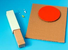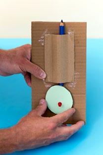 Vystřihněte tvar vačky podobně jako na obrázku a nasaďte ji na osu na svisle postavené desce. Do volného držáku nad vačkou vložte tužku a sledujte její pohyb při otáčení vačky.