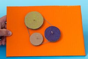 Do polystyrenové desky zapíchněte kousky špejlí, nasaďte na ně kladky a zkuste, jak pracují následující převody. Nejprve spojte gumičkou dvě stejně velká kola a jedním otáčejte. Jak se točí druhé kolo? A co když nebudou mít kola stejnou velikost? Zkuste také různá uspořádání se třemi koly. Jaký vliv má poloha kola vůči řemenu na směr otáčení?