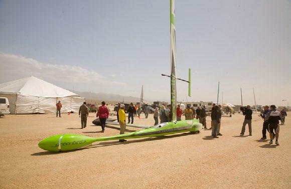 pojmenovaný Greenbird („Zelený pták“). Štíhlé vozidlo z uhlíkových vláken má tři kola v aerodynamicky tvarovaných krytech. Jako plachta pohánějící vůz slouží kolmo vztyčené křídlo, zatímco vodorovné rameno, na němž je připevněno boční kolo, slouží zároveň jako přítlačné křídlo, díky němuž se vozidlo nepřevrátí. Vozidlo o hmotnosti 600 kg dosáhlo na rovném dně vyschlého nevadského jezera neuvěřitelné rychlosti 203 km/h! Tento rekord pochází z roku 1999 a překonal deset let starý rekord jiného Američana, Boba Schumachera, jehož vůz Iron Duck („Železná kachna“) dosáhl rychlosti 187 km/h. Projektování a vylepšování rekordního vozu Greenbird trvalo deset let, ale vyplatilo se. A co vy na to? Přijdete s ještě lepším řešením a vytvoříte nový rekord?