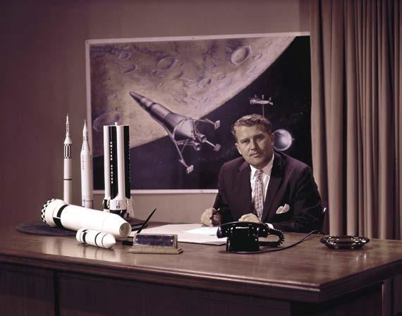 Wernher von Braun (1912–1977) ve své pracovně; za povšimnutí stojí jeden z návrhů lunárního plavidla na plakátu.