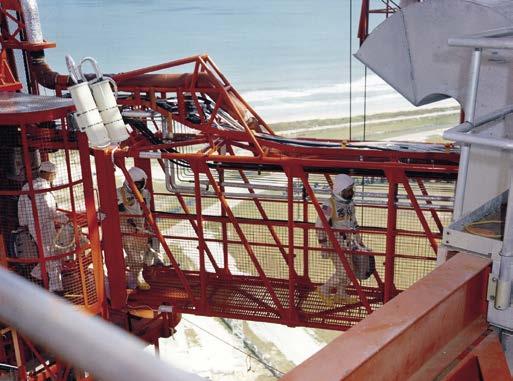Poslední fotografie astronautů pořízená dne 27. ledna 1967 při nastupování do lodi Apollo: Virgil Grissom vpravo, za ním Roger Chaffee.