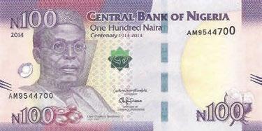 Symboly měnových jednotek – bankovka Nigérie 100 naira z roku 2014 se symbolem ₦