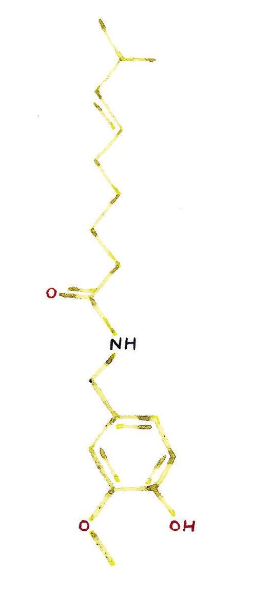 Jakmile se pálivá paprička dotkne jazyka, máme pocit, jako bychom olízli slunce. Pocity pálení po kontaktu s chilli cítíme na jazyku, ale i na jiných částech těla včetně žaludku. Nemusíme se ovšem bát, nehrozí nám žádné popáleniny ani trvalé poškození buněk. Pocity pálení způsobují KAPSAICINOIDY, alkaloidy vylučované chilli papričkami. Kapsaicin a další podobné alkaloidy pouze zmatou naše nociceptory, nervová zakončení detekující bolest a teplotu. Nociceptory začnou vysílat do mozku stejný signál, jako kdybychom se dotkli rozpálených kamen, a následovat mohou i tělesné reakce jako pocení nebo zčervenání. Pokud si dopřejete pěkný nášup, nelze vyloučit ani halucinace. Později se ale rozhodně dostaví příjemné pocity, vyplavením endorfinů vás tělo odmění za prodělané útrapy. Kapsaicin poprvé extrahoval v roce 1816 Christian Friedrich Bucholz a od té doby se chemici snažili získat jeho čistou formu. V roce 1876 pak odhalili, že částečně čištěný kapsaicin vyvolává na sliznicích pocity pálení a zvyšuje sekreci žaludečních šťáv. Od té doby již ale výzkum značně postoupil a dnes víme, že alkaloidů z rodiny kapsaicinoidů je více než dvacet. Každý z nich má jinou intenzitu pálivosti. Nejčastěji je ale zastoupeno pět látek: kapsaicin (69 %), dihydrokapsaicin (22 %), nordihydrokapsaicin (7 %), homokapsaicin (1 %) a homodihydrokapsaicin (1 %). První dvě látky jsou nejostřejší, poslední dvě dosahují asi poloviny jejich síly. A každá z nich pálí trochu jinak — nordihydrokapsaicin vás celkem příjemně a rychle zahřeje na patře a v přední části úst, kapsaicin a dihydrokapsaicin pálí už více a kromě úst a patra se rozlévá až do zadní části jazyka a krku, homodihydrokapsaicin se chvíli rozžhavuje, než