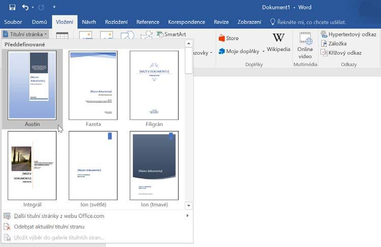 Vytvořený dokument můžete obohatit o novou titulní stranu, a to prostřednictvím příkazu Titulní stránka, kde máte na výběr z předdefinovaných šablon nebo online šablon z webu Office.com
