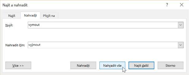 Na kartě Domů přejděte ve skupině Úpravy na Nahradit. V okně Najít a nahradit do pole s názvem Najít napište slovo, které nahrazujete. V poli s názvem Nahradit čím vepište slovo, kterým chcete nahradit. V případě, že chcete nahradit všechny výskyty slova v Najít, klepněte na tlačítko Nahradit vše. Mohou nastat situace, kdy byste raději viděli, co Word nahrazuje – potom zvolte kombinaci tlačítek Najít další a Nahradit. Při postupném klepání na Najít další Word slovo v dokumentu postupně hledá a zároveň uživateli zobrazuje a až po potvrzení Nahradit skutečně nahradí. Více možností nahrazení textu najdete po klepnutí na tlačítko Více. Nabídka s možnostmi je obdobná jako u nabídky rozšířeného vyhledávání, viz podkapitolu Rozšířené vyhledávání.